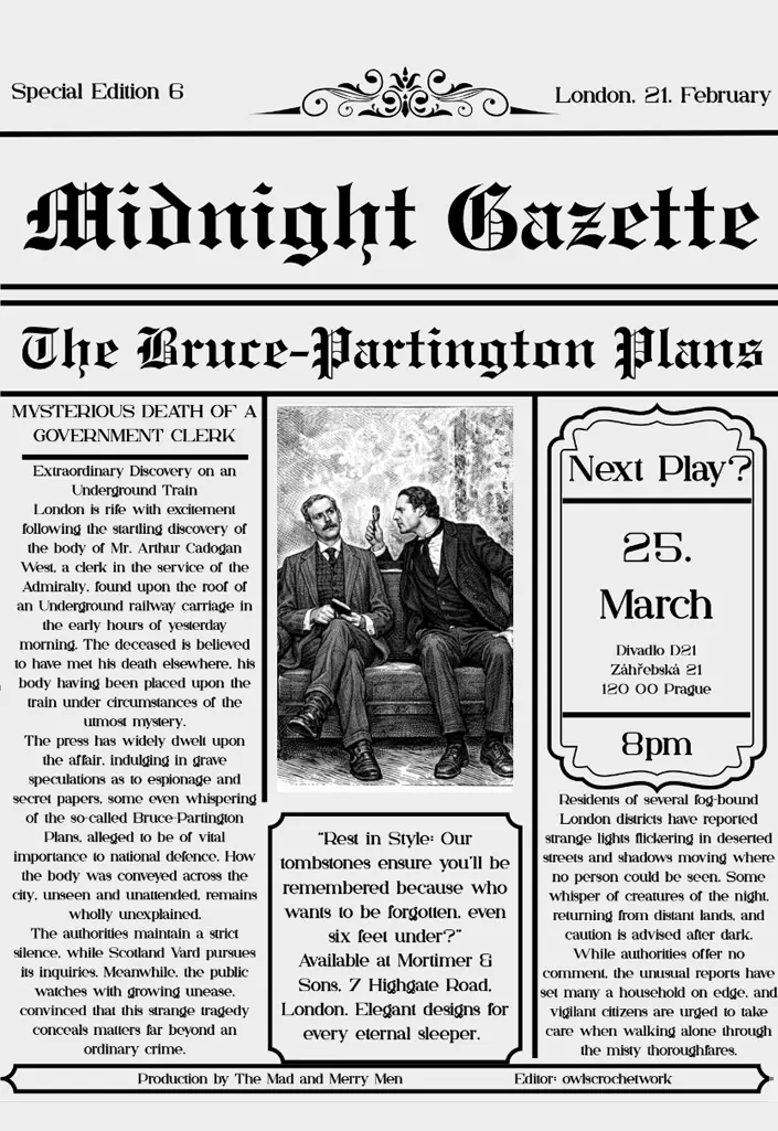 Ergänzt wird dieses Universum durch kreative Erweiterungen wie die „Midnight Gazette“, eine fiktive Zeitung, die zugleich als Programmheft dient. Sie verbindet die Bühnenhandlung mit historischen und aktuellen Bezügen, lädt das Publikum zum Miträtseln ein und vertieft die Immersion. Auch visuell wird der Anspruch deutlich: Plakate im Stil des 19. Jahrhunderts schaffen eine einheitliche, düstere Ästhetik, die alle Teile der Serie miteinander verbindet.